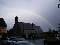 A strong rain blew through right as the festivities were to begin. We kept dry in the Saint Lachtain church, pictured here with an amazing rainbow after the downpour. The conker championships quickly resumed.