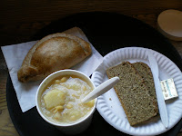 Bill’s lunch: Traditional Cornish Pasty (shredded beef, potato and swede), yellow split pea and celeriac* soup with brown bread.