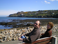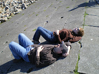 After we bought some asparagus, pasta, strawberries and scones, we walked along the seawall. We found a bench with an agreeable view and there spent a pleasant hour or so. Bill and Peggy became so relaxed as to lie upon the ground.