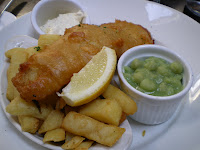 I took the plunge recently, and I have to tell you: I like mushy peas. They do have that earthy split pea flavor, and they are green green green! Pictured right is a fish and chips plate I had in Carlingford, and my first dish of mushy peas. What a beautiful moment.