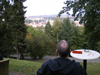 Monday we explored the narrow streets of Nový Svět and walked on the grounds of Prague Castle, and then took the tram to the funicular for a ride up Petrin Hill. We exited at the top of the funicular track and walked through the woods. We saw the Hunger Wall, a fortification built in 1360 under the reign of Czech King Charles IV that provided wages to workers during a time of famine. We stopped for coffee at a scenic cafe halfway up Petrin Hill. After a late lunch, a bit more shopping (chocolates!), and another walk on the Charles Bridge, we headed fo