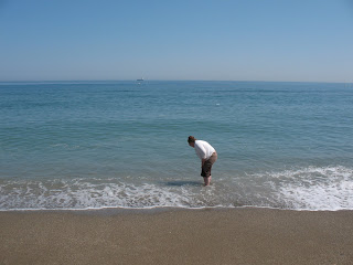 Later we walked down to the beach for lunch. We had some gazpacho–gazpacho originated in Andalusia–and I ordered grilled squid. I had been profoundly changed by the grilled squid I had in Barcelona; the grilled squid I had here was a bit bigger and filled with goo, but the non-goo parts where tasty and I could watch a guy stick the squid on the end of a pole and grill it over charcoal, so that was cool. We also had some tortillitas and Bill had gambas al pil pil (spicy shrimp).