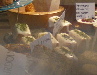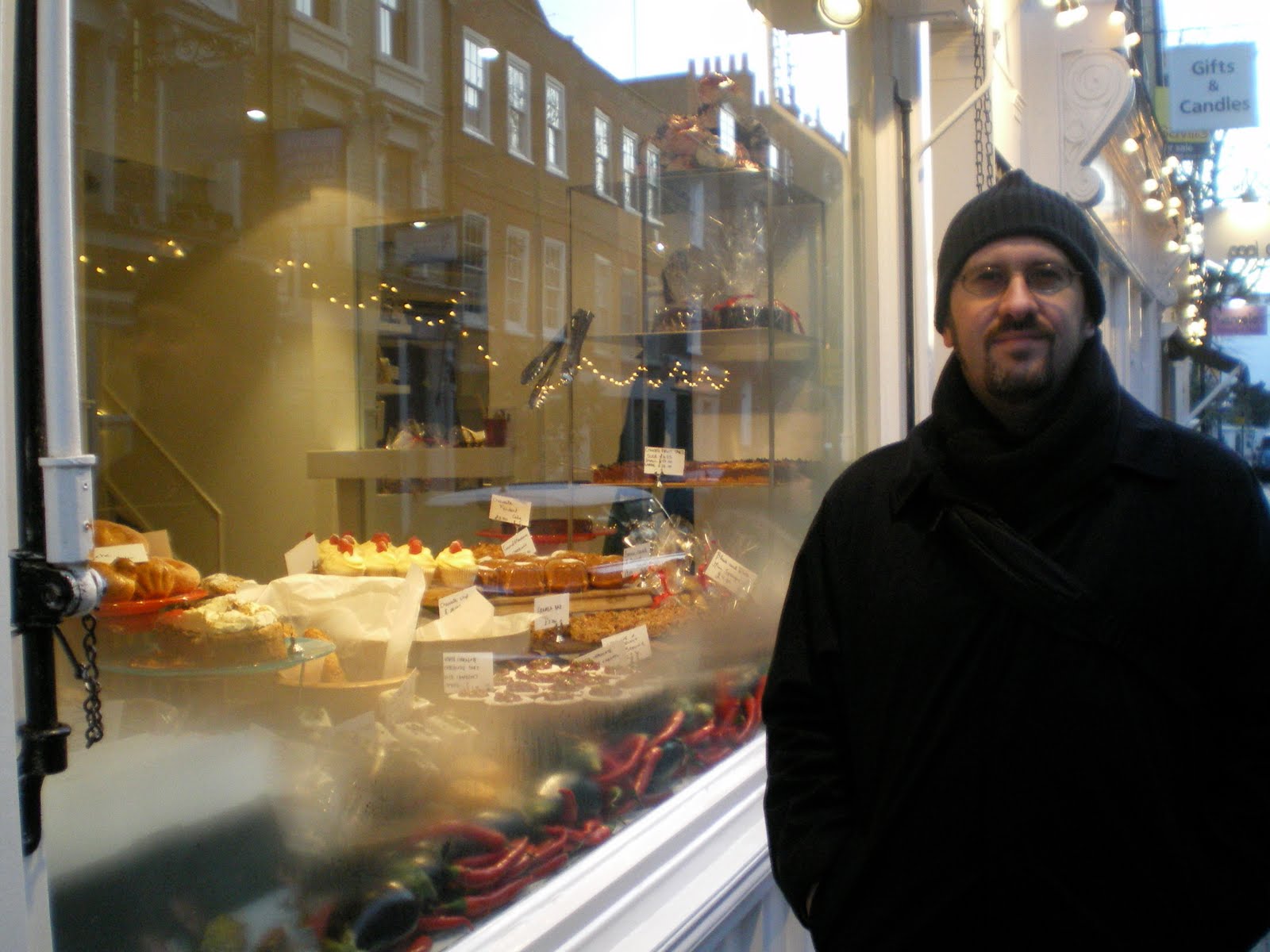 We stared in the window for a while, snapped a pic and walked on. Then we turned around and bought two of these Lemon Polenta Cakes with Pistachio to take as a snack on the plane. These cakes were tremendous–very moist, luscious with lemon and rose water aroma, just sweet enough.