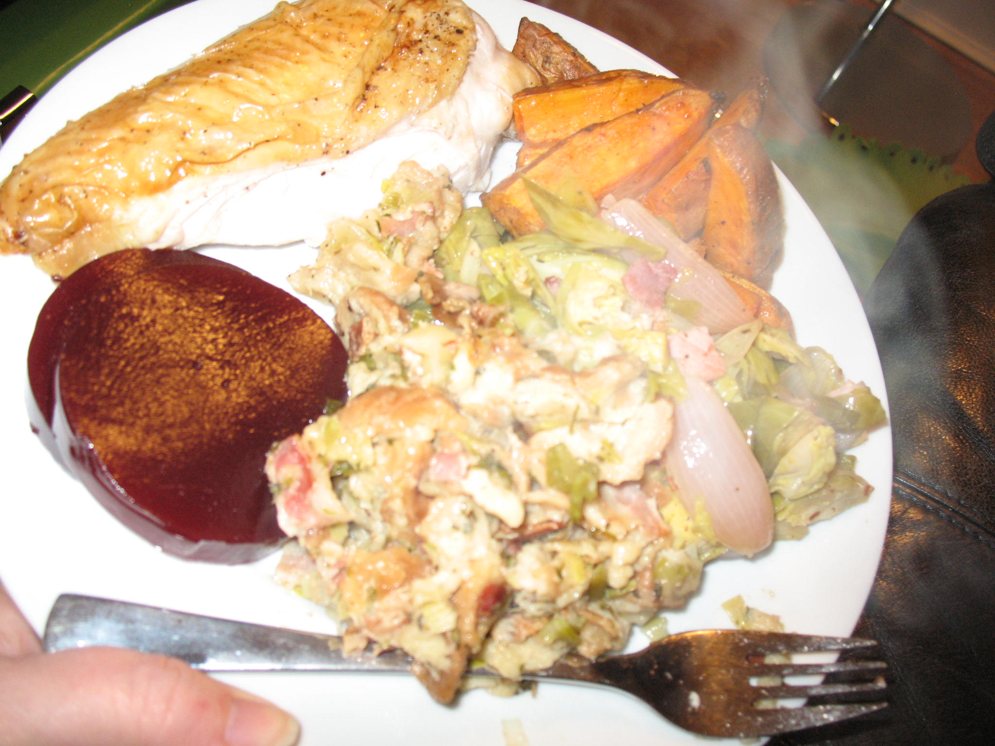 • Herb stuffing with Apple, Leek and Bacon–a savory bread pudding; this Cooks Illustrated recipe (which Bill halved) was the “something new” this year and we expect to see it again