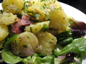 Friday I had a craving for French potato salad–the kind with a mustardy vinaigrette instead of a mayo-based dressing. I also wanted something smoked. I hedged and bought both smoked mackerel and some Polish smoked sausage. The sausage won.