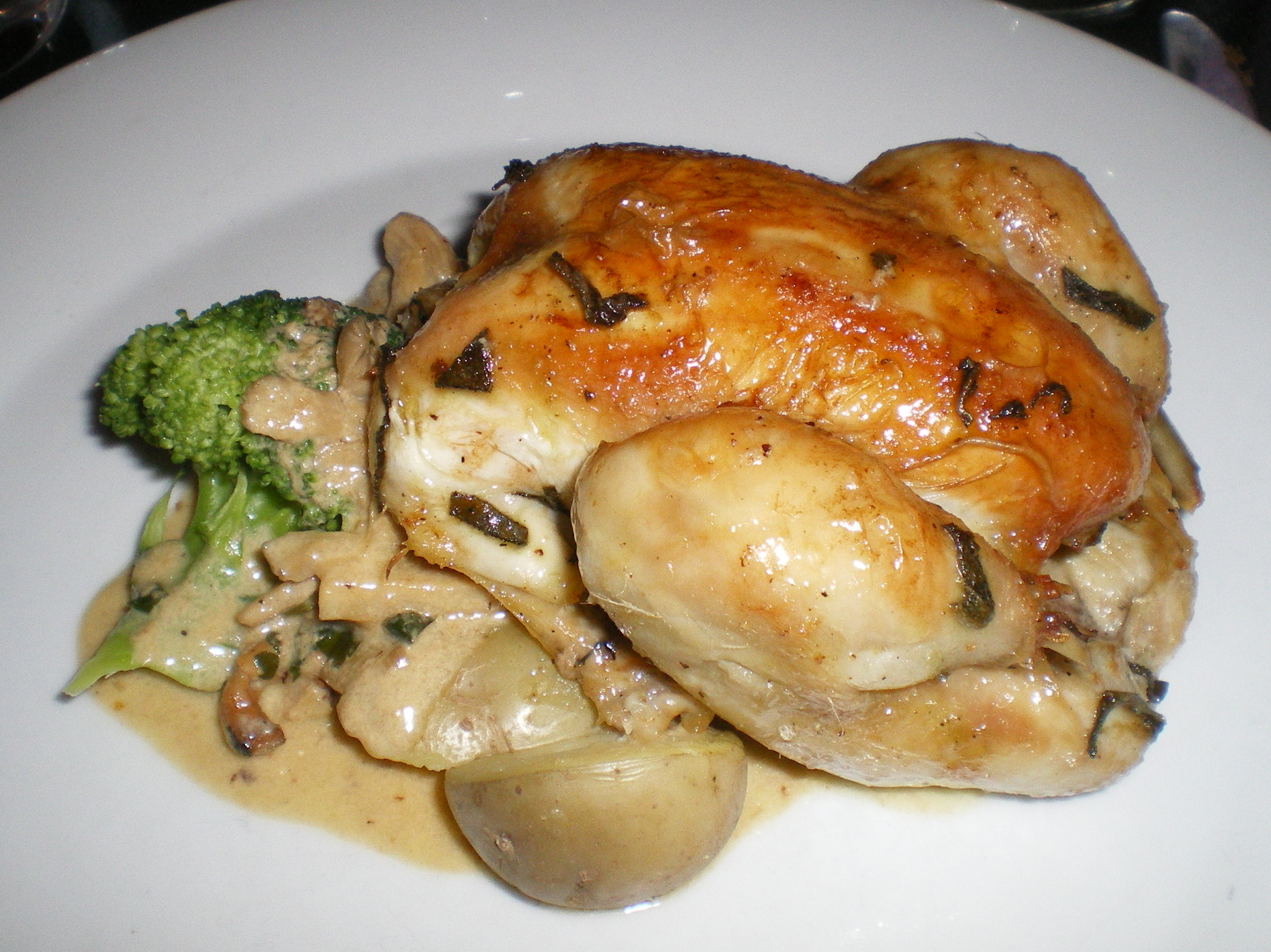 The fact that the Ely chefs are cooking from another chef’s recipes is a an interesting aspect of cookbook club, as well as the expectation that you can recreate the dishes for yourself. The mains were our favorite part of the Kevin Dundon dinner. I had a Spiced Fish Stew, which could have been spicier, but was tasty nonetheless. Bill’s Oven-baked Poussin with white wine and mushroom sauce was lovely; the chicken was very tender and moist. We both had the Baileys Creme Brulee tart which was an interesting melding the two forms, definitely something that would be easier to cook at home. I had a salad with gorgonzola cheese and honey-roast peaches for a starter. Bill had the crab bisque which tasted nicely of sherry but was missing some crab sweetness. We definitely thought it was better than the crab bisque we’d had recently at King Sitric, which was a Gunter-Lamb family disappointment.