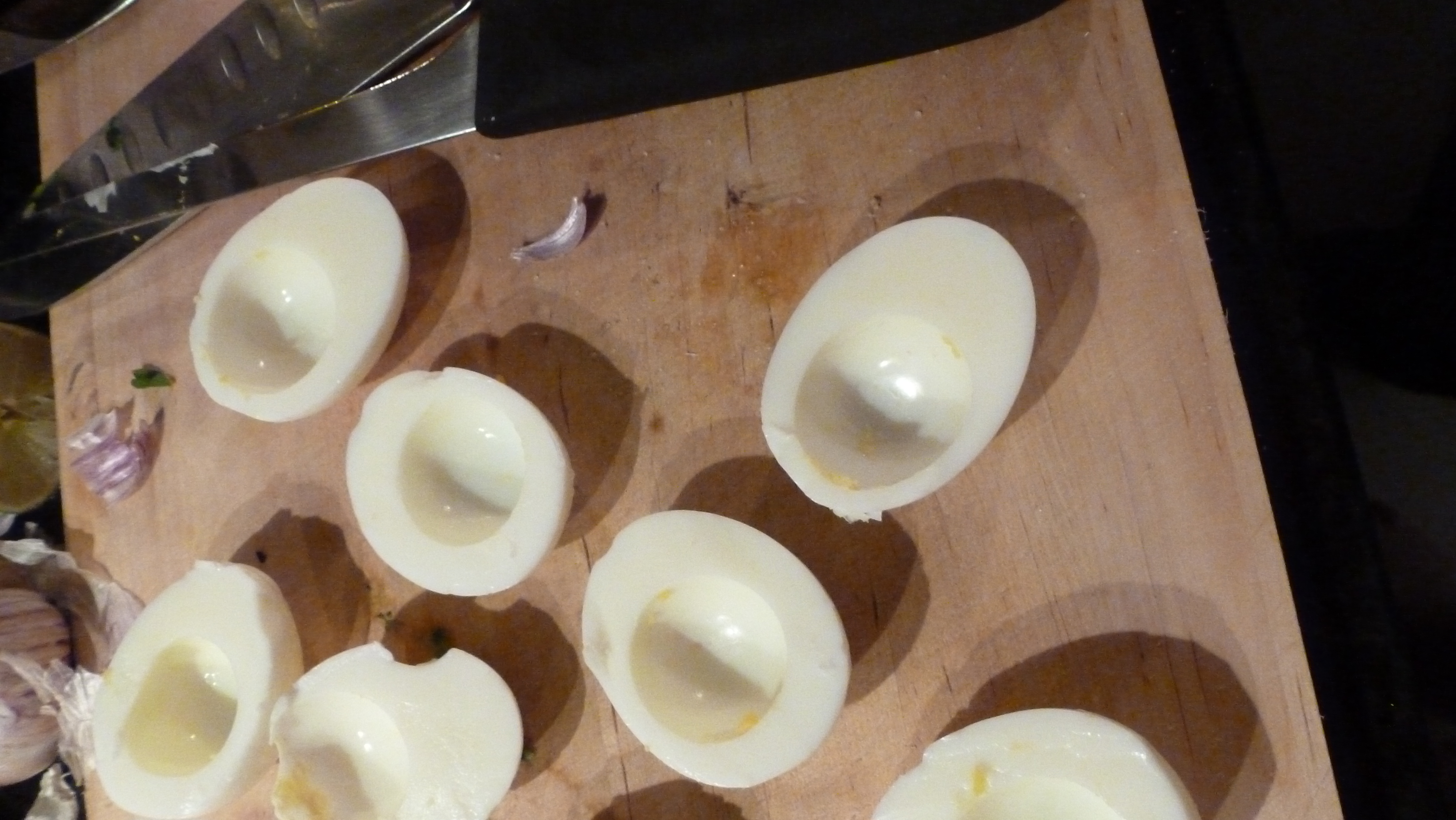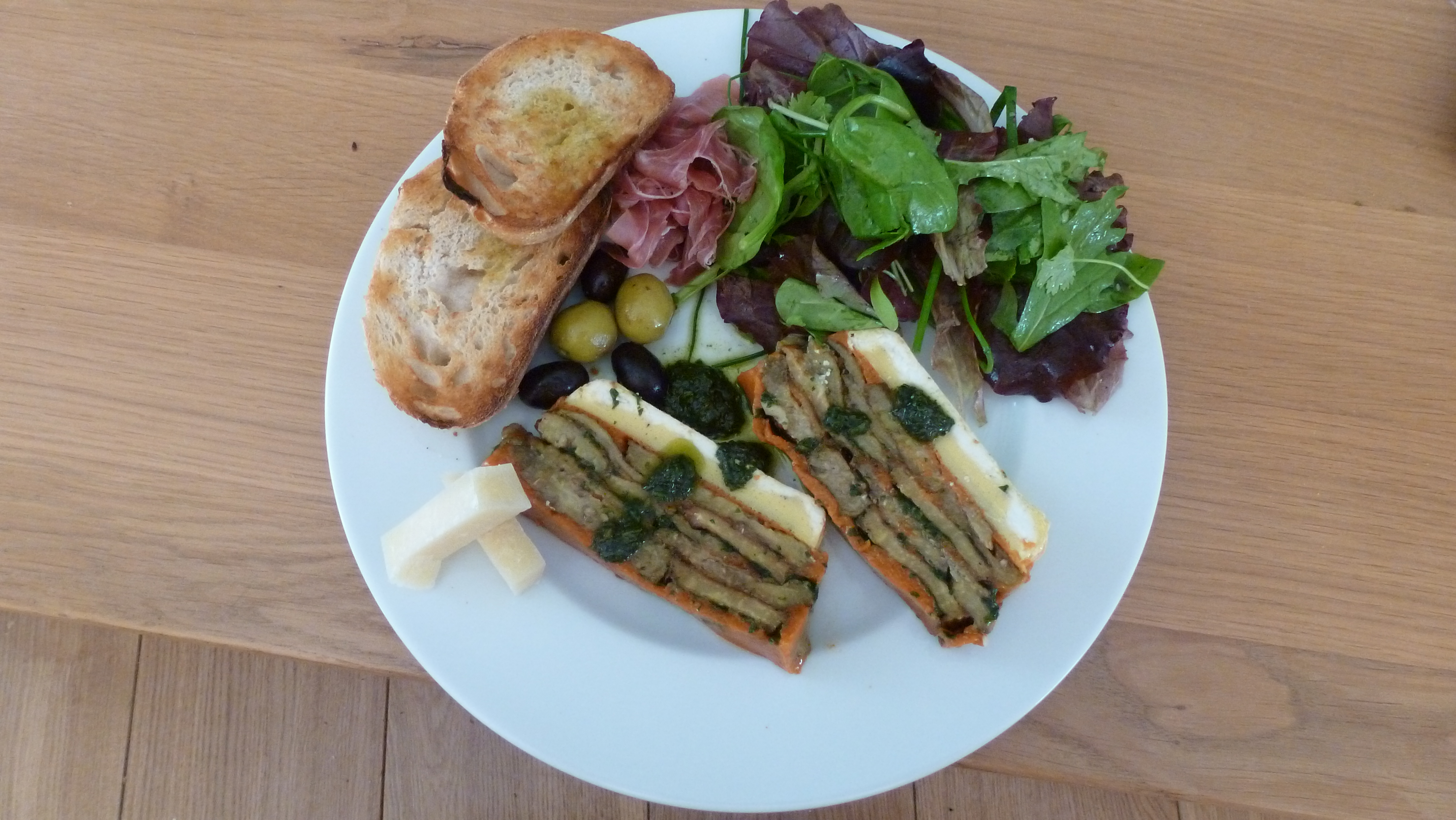 But we reckoned some cooking was required for the Irish Foodies Picnics & Parties Cookalong. It’s not called a Shopalong after all. We started thinking about a nice terrine like the chicken and lemon terrine from On the Pig’s Back, but as Bill explored recipes he was attracted to an Eggplant/Auburgine Terrine from Saveur. The picnic was also the perfect opportunity to make the deviled eggs from Orangette I’ve been dreaming about, and I’d also get to use my egg plate!