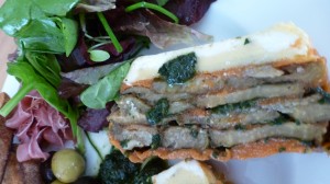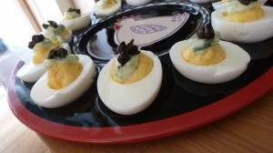 The terrine is a bit involved and took a couple hours to roast the eggplant, make the custard layer, and assemble the terrine. Bill noticed the terrine recipe didn’t say to puree the red pepper, but it wouldn’t have matched the photo otherwise. He used a loaf pan as we don’t have a terrine pan. Bill made the terrine Thursday night, and we ate it for lunch Saturday along with some dressed greens, Parmesan cheese, olives and fantastic deviled eggs. The terrine is a perfect summer lunch; it makes plenty for several people. We were wondering if the custard layer is absolutely necessary, but it may help adhere the goat cheese, and it is an additional texture layer. Bill used St. Tola’s cheese which was delicious. Also, Bill was reminded that slicing and roasting eggplant is a very easy step, and it tastes great on its own, so we’re going to keep that in mind this summer as markets are bursting with the purple beauties.