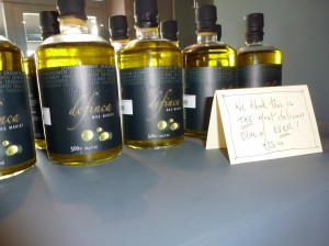 Jeni and Reuven were so kind to gift us each with a box of bakery samples, tied with a Brown Hound ribbon. I’ve heard that these treats did not last long for anyone. There’s a particular buzz about the chocolate banana bread and I have to join in that chorus. It’s moist, perfectly sweet, with huge chunks of delicious chocolate. We also bought a brown butter cake with lemon curd–beautiful to gaze upon, great texture, nicely tart lemon curd. I like that many of the cakes come in several sizes, including cupcake. We picked up a bottle of that gorgeous olive oil as well.