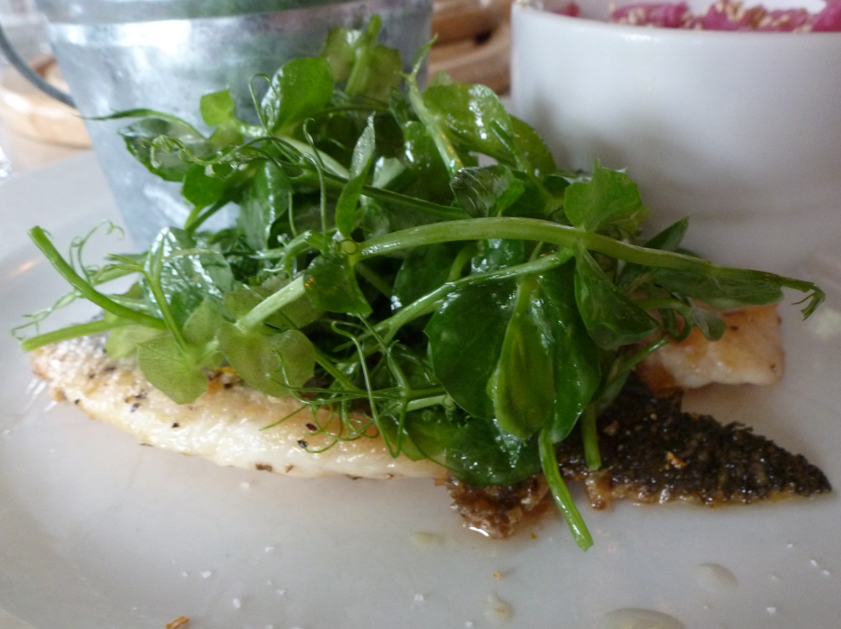 For mains I had the sea bream special with lemon salt and pea shoots. I chose Asian slaw and sweet potato wedges for sides. The fish was delish, especially the skin, and my sides were two great tastes that taste great together. The vinegary sesame flavor of the slaw was particularly refreshing. Bill’s rabbit was outstanding, tender and luscious with sides of perfect spinach and balsamic-laced lentils. The rabbit loin was char-grilled and topped with a smoked bacon and rabbit “ragù.” The smokiness from both the grilling and bacon perfectly complemented the tender rabbit.