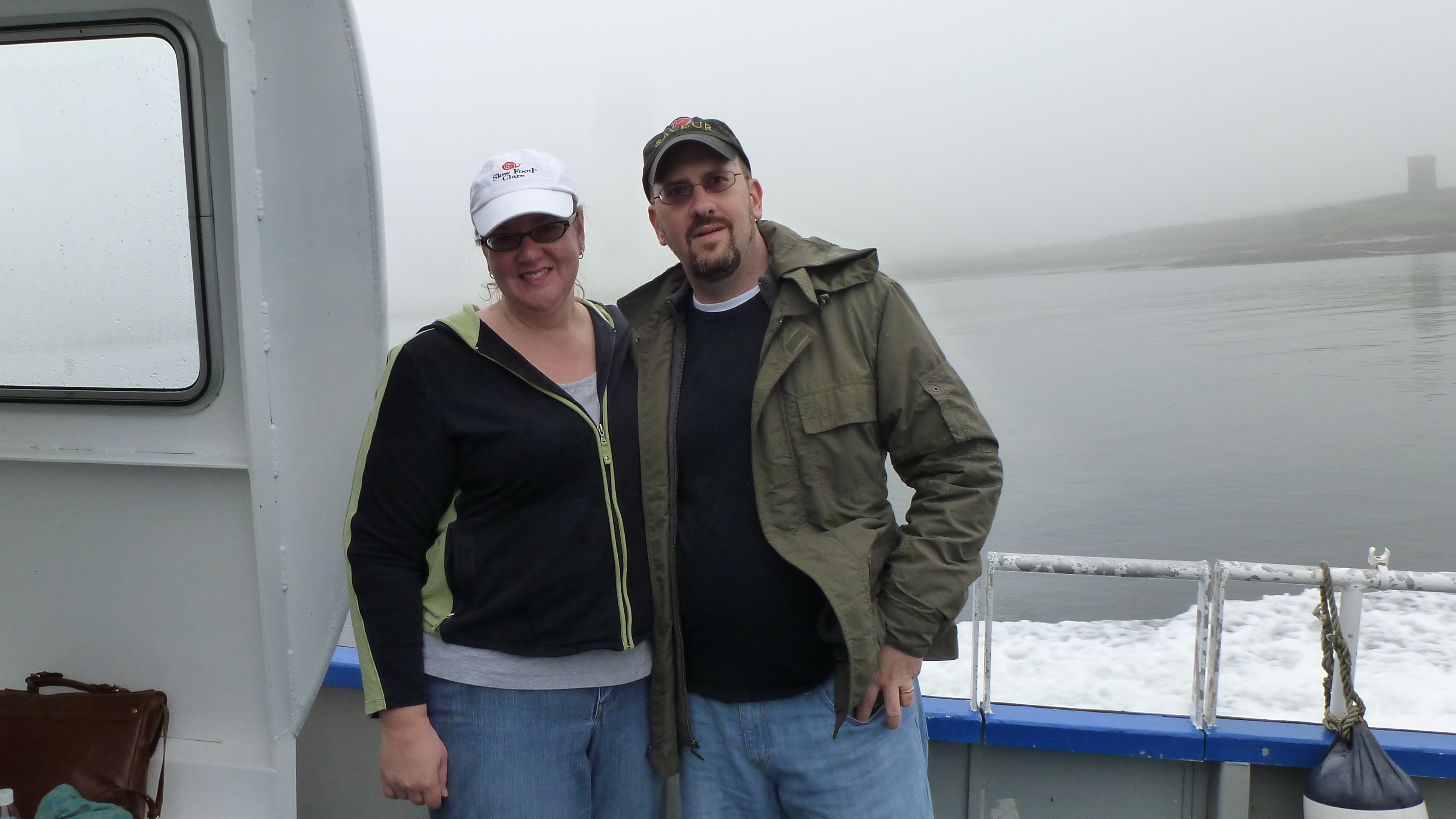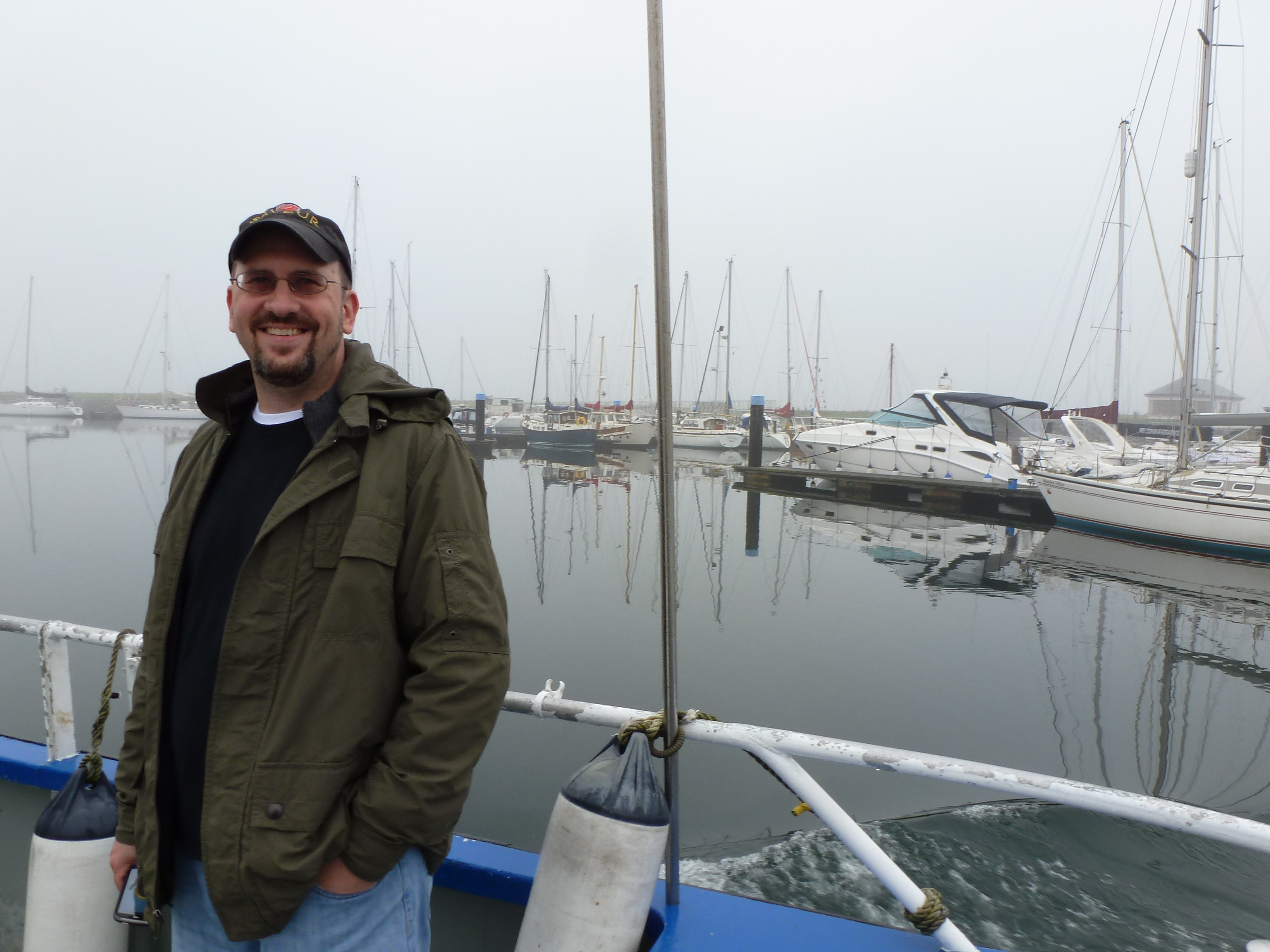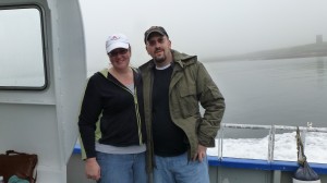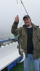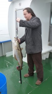 We boarded the Sarah Ellie and headed off across the glassy water. We could see the mouth of the bay in the mist, but in a few minutes we were lost in the fog. Our skipper, Paul, killed the engine and gave us a two minute lesson on sea fishing–Let her out, keep your thumb on the spool, then reel her back in a little. Out. In. Keeping her moving.