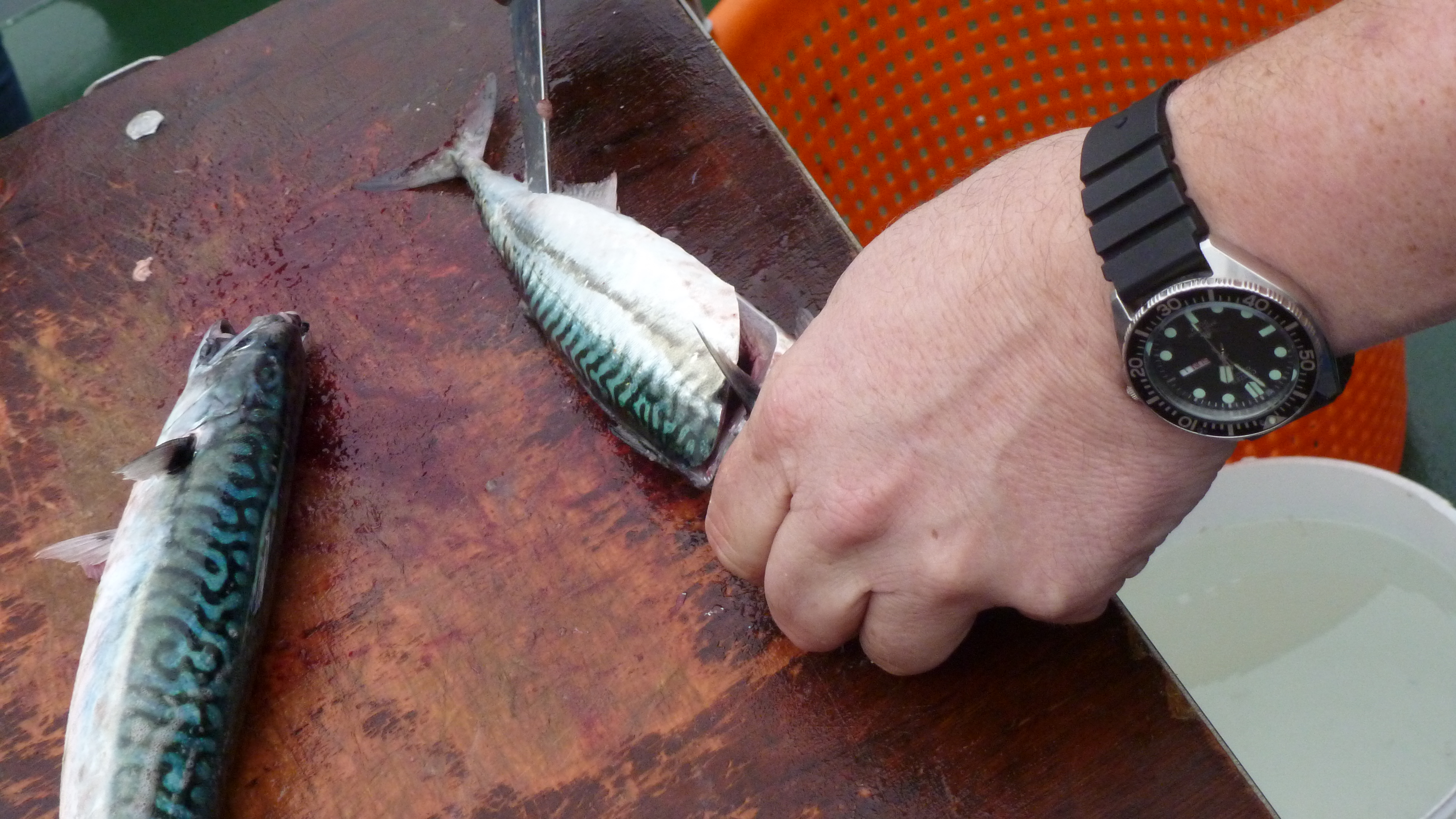 From the moment the first lure hit the water, our day turned magical. Within seconds Ollie had reeled in a 6kg pollock. It was a stunner of a fish. We were all amazed. Even Paul was amazed. The fish went into the blue fish bucket, and we all set ourselves to fishing, hoping to match Ollie’s catch. In. Out. Keep her moving. A few more pollock came on board. I caught one that weighed few kilograms. We caught lots of mackerel. They all went into the fish bucket, gasping a bit, but shining silver, the mackerel’s backs covered in green and black tiger stripes.