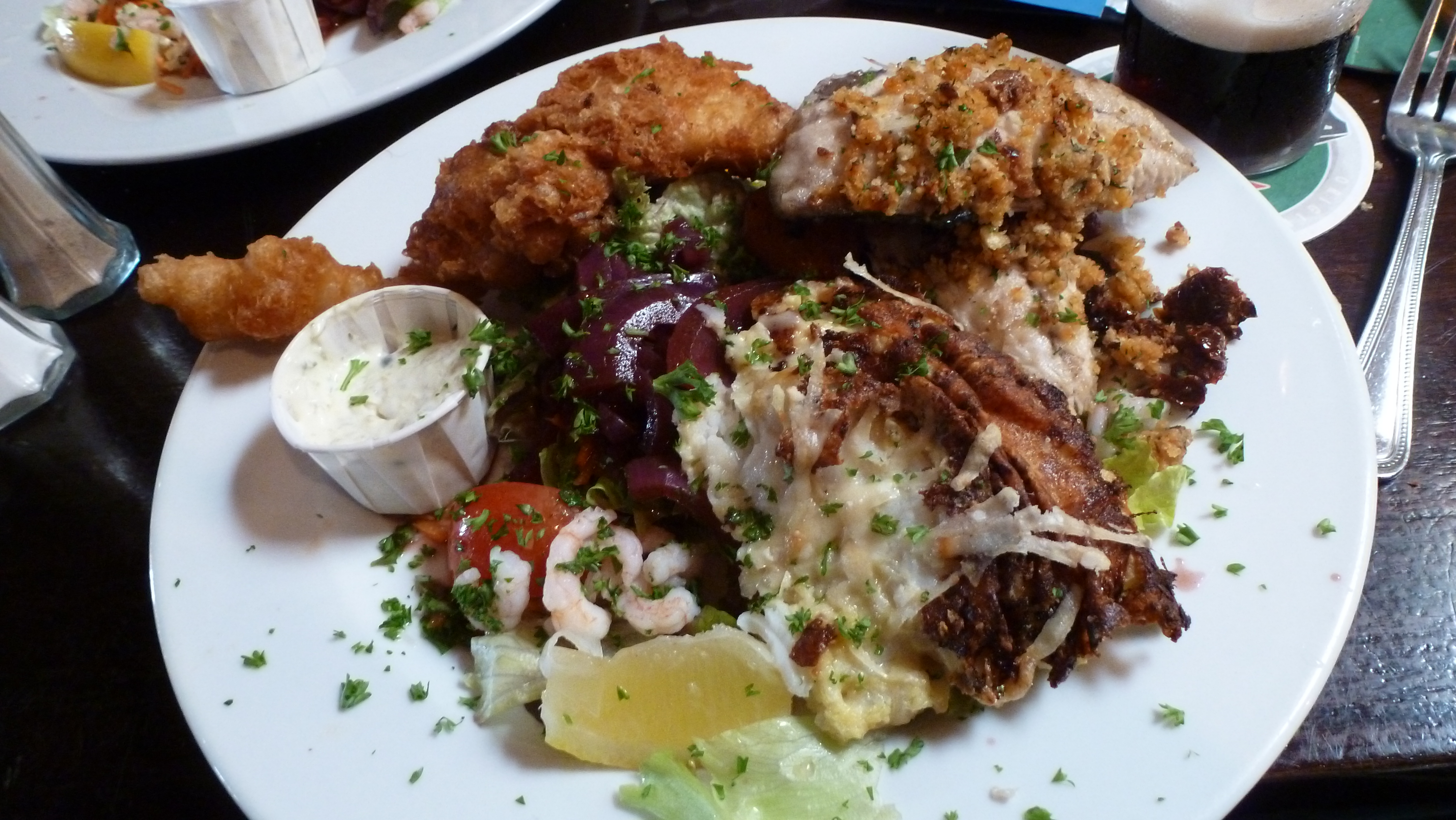 Darcy is the chef at Marina Inn and she prepared some of our fish for lunch. We washed the scales from our hands, and restored ourselves with post-voyage pints of Guinness and Crean’s lager (from Dingle Brewing Company). We shared a starter of tasty mussels in cream sauce. Darcy played a blinder* and served us three fish dishes–fried, beer-battered pollock; pollock with Parmesan cheese crumb; and mackerel with chorizo, potatoes and sun-dried tomatoes. Everything about the fish was great–the texture, the flavor. Eating fish that had been swimming in the ocean not more than 90 minutes before is incredible. I think the mackerel was a favorite–it has a bit more flavor that the pollock. A lunch to remember.