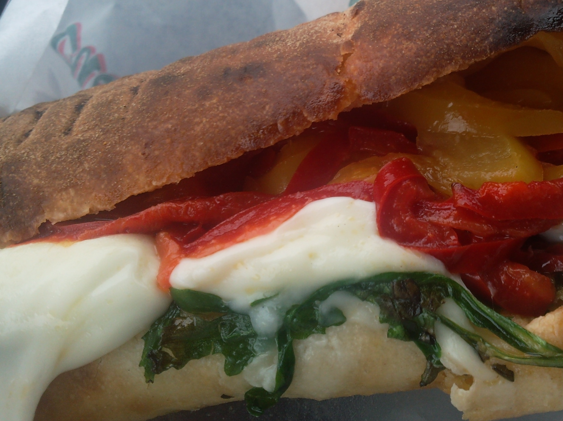 While not exactly handy to Dublin City Centre, La Cucina is absolutely convenient and worth a stop if you are anywhere near Limerick. On our way to Dingle last month we saw some tweets from icanhascook about stopping by, so I used my fancy phone to look up the location and determine we would be in the vicinity right at lunchtime. Since we were on the road, we popped in for a couple ciabatta sandwiches to go: the grigliatia with roasted peppers and aubergines/eggplant, mozzarella, rocket/arugula and pesto (pictured); and the salumi with parma ham, salami, and buffalo mozzarella. Yum. Terrific sandwiches–a steal at €5.00. In addition to loads of lovely sandwiches, La Cucina serves pizza (I’m still regretting not getting a slice for “starter”) and pasta with tantalizing ingredients. We’ll be visiting the next time we’re nearby, even if it isn’t lunchtime!