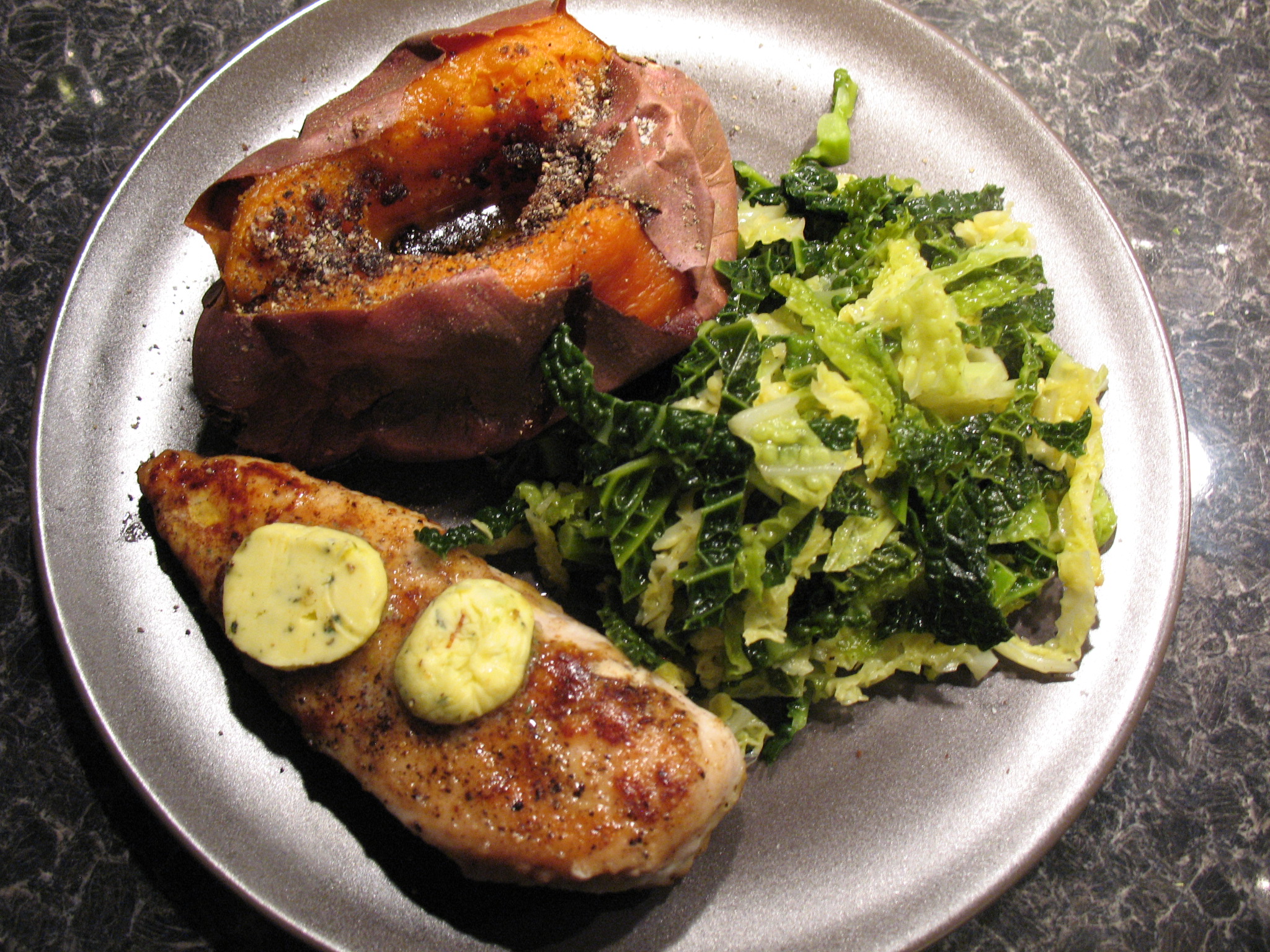 This technique for cooking boneless chicken breasts is pretty foolproof. They were tender and juicy with a good crust. The compound butter added just the right amount of fat and herby goodness. Buttered cabbage is also a favorite of mine and a tiny bit of chicken broth gives it savor.  Sweet potatoes topped with brown sugar and butter are intrinsically delicious, but the black pepper  adds intriguing spicy and aromatic flavors. Oh, and do all three components contain butter? Score.