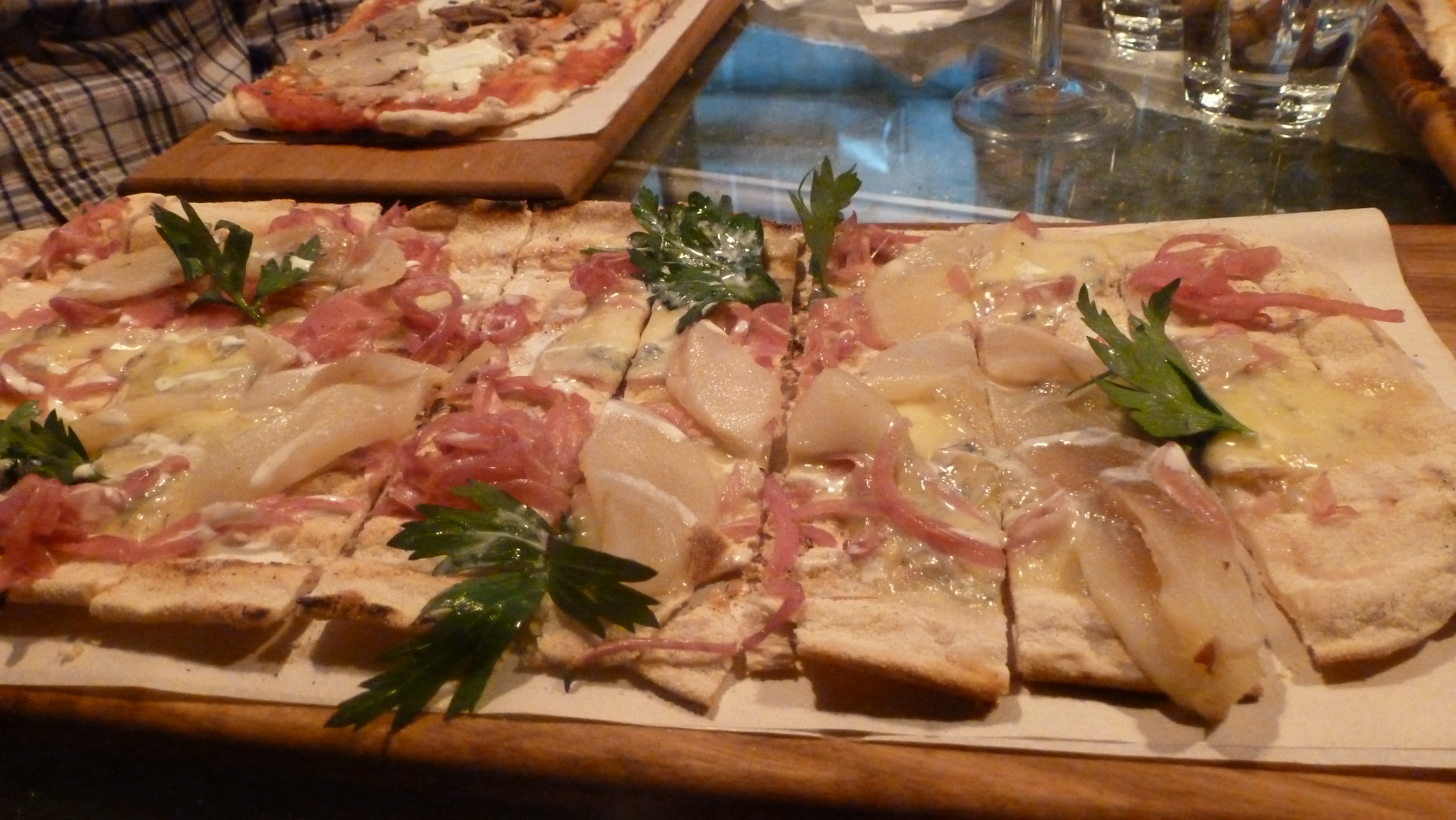 Then we ordered our pizzas. We ordered almost every pizza. There are 10 set pizzas on the menu, each named after the mother of a staff member. One of our party went for the daily meatballs, which today were lamb. (Check twitter for the daily meatball.) I ordered the Lil which is Boyne Valley blue, poached pear, sweet pickled onion and cream. Yeah. Bill chose the Tess with pulled pork, fennel seeds, braised fennel and marscapone. The table also saw some amazing combinations like roasted garlic confit, toasted hazelnuts, tomato, Fontina and spinach & butternut squash, rosemary, ricotta, capers and espelette.