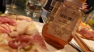 I recommend going to Skinflint with six to eight friends so you can taste all the pizzas. It was hard to pick a favorite. I was almost overwhelmed by all the amazing flavors on our table. I’ll say braised fennel stands out as a genius pizza topping, and Bill was quite taken with the butternut squash and caper combo. My pizza was a perfect celebration of the love between pear and blue cheese, and Joe is proud to be using Boyne Valley blue which is a goats cheese blue. A stronger blue, but right at home on that pizza. I also liked the housemade Mexican chorizo, and roasted garlic is another brilliant pizza topping. Pizza is all about bringing flavors together to create greater-than-the-sum-of-its-parts-Super Flavor, and these pizzas are super. Especially drizzled with Skinflint’s Firebee honey infused with chile. Seriously, this honey should be given out to school children to teach them about the good things in life. No wait, perhaps it should be a reward for becoming an adult. Either way, it’s great.