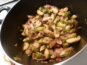 The Brussels sprouts were Bill’s contribution. In 1998 Bill made a Thanksgiving Menu from Food & Wine Magazine which included Brussels Sprouts pan roasted with shallots and pancetta. These sprouts instantly became a must-have Thanksgiving dish for us, and have made more than one Brussels Sprouts convert. As many times as Bill has made this dish (it’s not just for Thanksgiving!) these were some of his best. The shallots and sprouts were browned and nicely caramelized and silky with pancetta “flavor.”