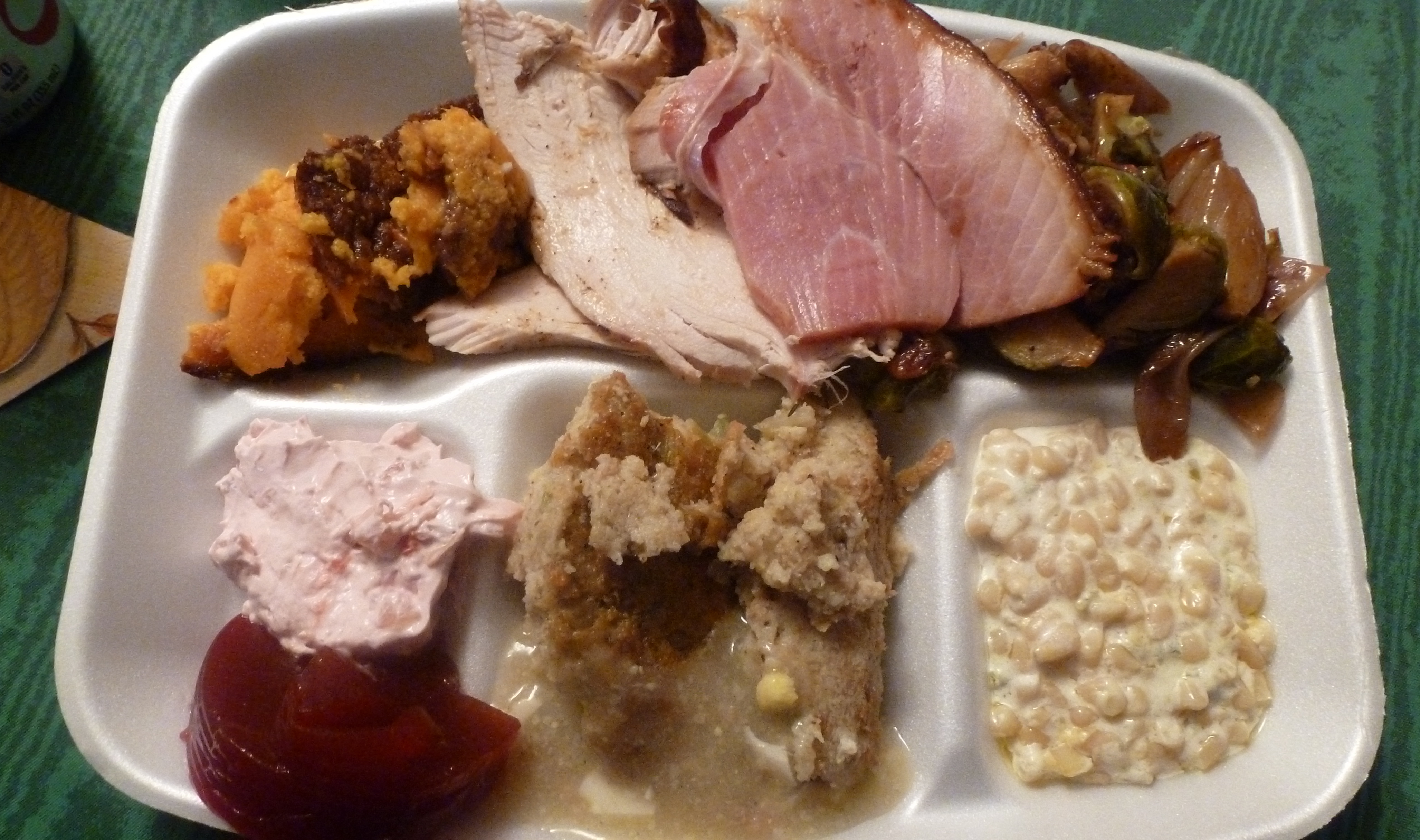 The Meal (clockwise from top left): Sweet Potato casserole, turkey, ham, Brussels sprouts with pancetta, jalapeno corn casserole, cornbread dressing with gravy, jellied cranberry sauce, cherry fluff; not pictured: field peas, dessert