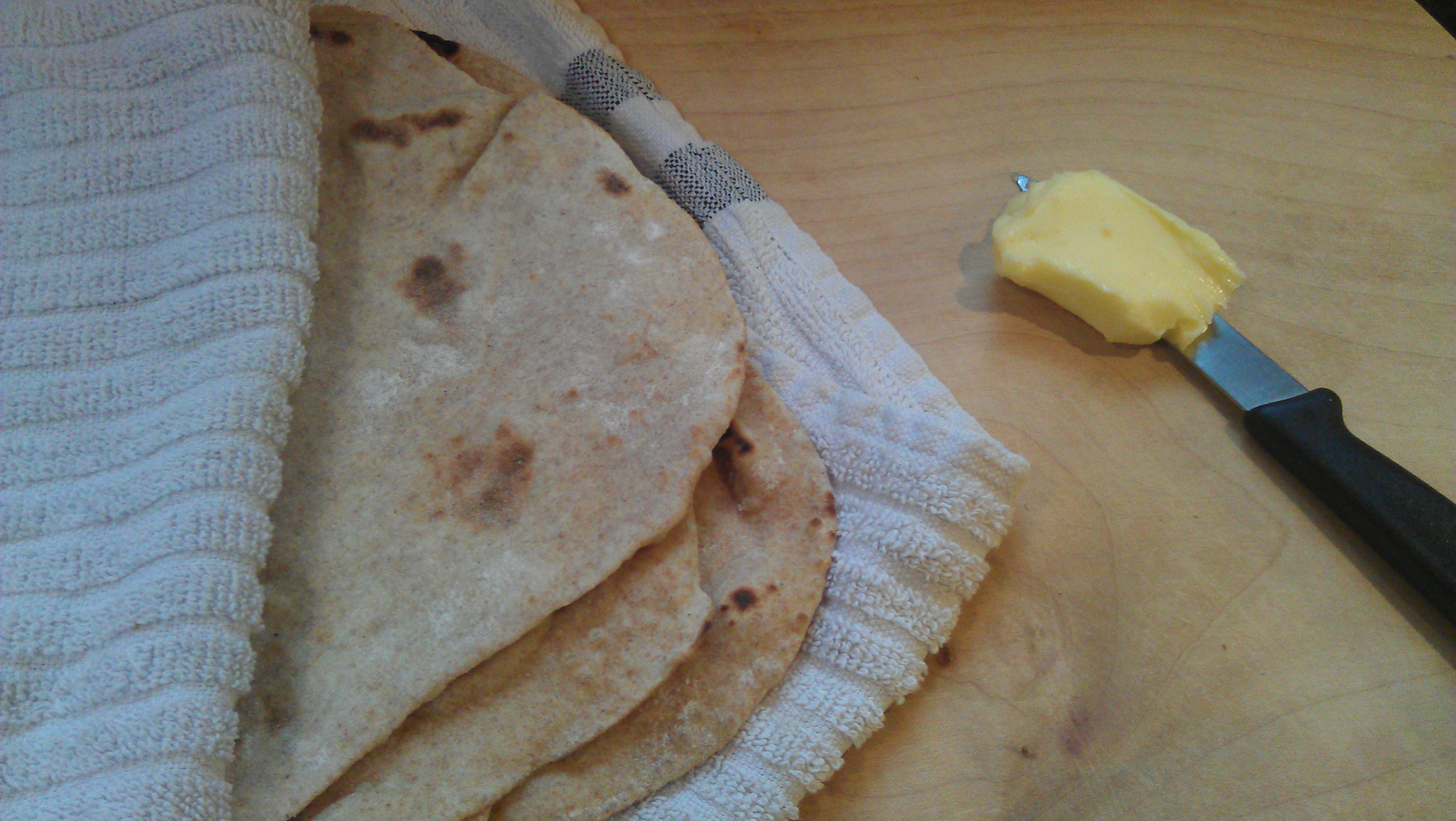 Whole wheat and spelt tortillas. The butter goes in the chicken dish, but buttered tortillas are not a bad idea.