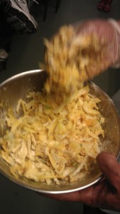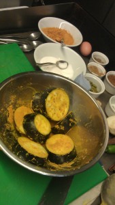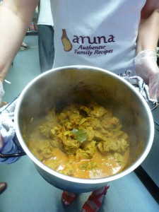 The Bangladeshi Street Food dishes Sarajit cooked today are familiar Indian restaurant offerings: Lamb Roganjosh, Chicken Curry, Onion Bhaji, Auburgine Bhaji, Dhal, and Spinach with Prawns. Street Food from any cuisine is food that people actually eat–everyday people in their everyday lives. Sarajit’s versions of these dishes represent the best of those everydays–days with local meats and veg, the very best spices, everything that is needed and nothing else.