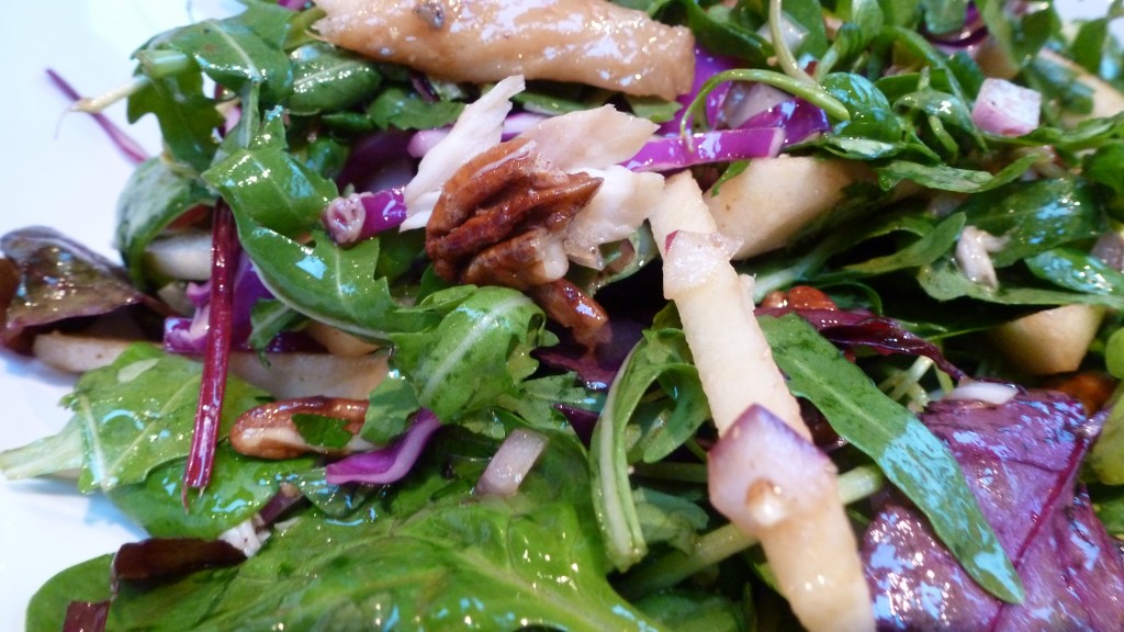 3. In a large bowl combine the mackerel with the pecans, greens, cabbage, apples, onion and parsley. Add the vinaigrette and toss.