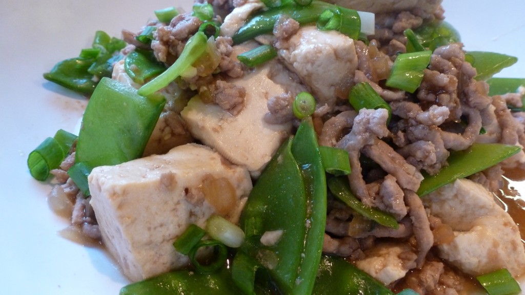 Large cubes of tofu are the perfect addition to this gingery pork and snow pea stiy-fry. The bland soybean curd takes on the spicy character of the dish. Serve with steamed rice.